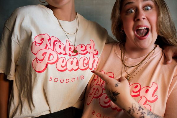 Our NAKED PEACH LOGO cropped tee is boxy fit and 100% ring spun US cotton.